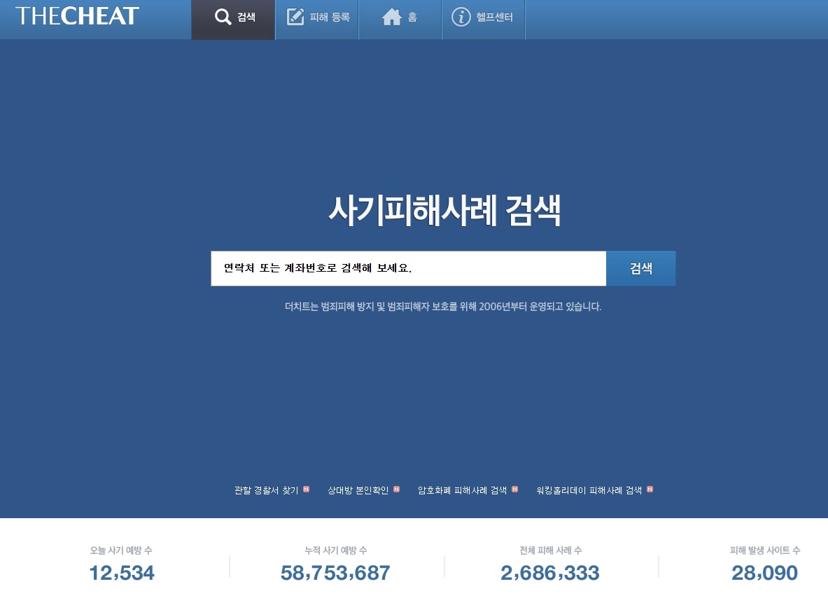 더치트(TheCHEAT)는 2006년 1월 4일 개설된 금융사기 정보공유 사이트로 전화번호나 계좌번호 또는 아이디를 조회해 중고 거래 사기 이력을 확인 할 수 있습니다. 간단한 무료조회로 누구나 쉽게 바로 이용할 수 있다는 특징이 있습니다.