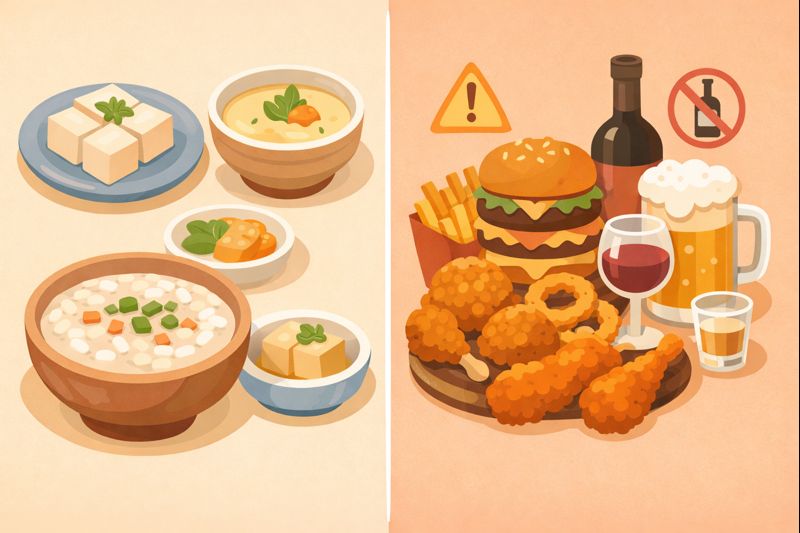 기름기 적고 소화가 빠른 음식 위주로 간단하게 먹는 것이 핵심입니다.