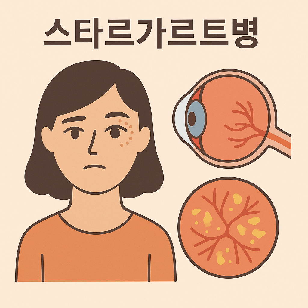 스타르가르트병은 중심 시력을 담당하는 망막의 황반(macula)에 영향을 미치는 유전성 퇴행성 질환입니다. 이로 인해 사물의 중심이 흐릿하거나 왜곡되어 보이게 되며, 색 인식 저하도 동반됩니다. 보통 청소년기부터 증상이 시작되며, 초기에는 주변 시력은 유지되지만 중심 시력이 급격히 저하됩니다.