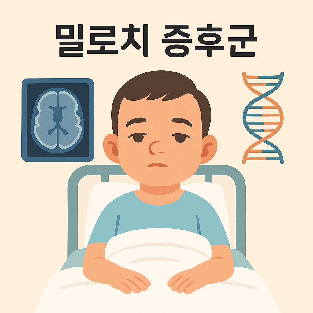 밀로치 증후군(Miller-Dieker syndrome)은 희귀한 염색체 이상으로 인해 발생하는 중증 신경발달 장애입니다. 뇌의 겉질이 정상적으로 발달하지 않고 평평하게 유지되는 '리스엔세팔리(lissencephaly)'가 특징이며, 이로 인해 심각한 지적장애와 간질, 운동발달 지연이 나타납니다. 일반적으로 생후 첫 해에 발작이 시작되며, 대부분의 환아는 생존 기간이 짧습니다. 이 질환은 대개 17번 염색체의 미세결실로 인해 발생하며, 산전 진단도 가능한 경우가 있습니다. 유전적 특성이 복잡하고 예후가 나쁜 질환이기에 조기 진단과 다학제적 치료 접근이 중요합니다.