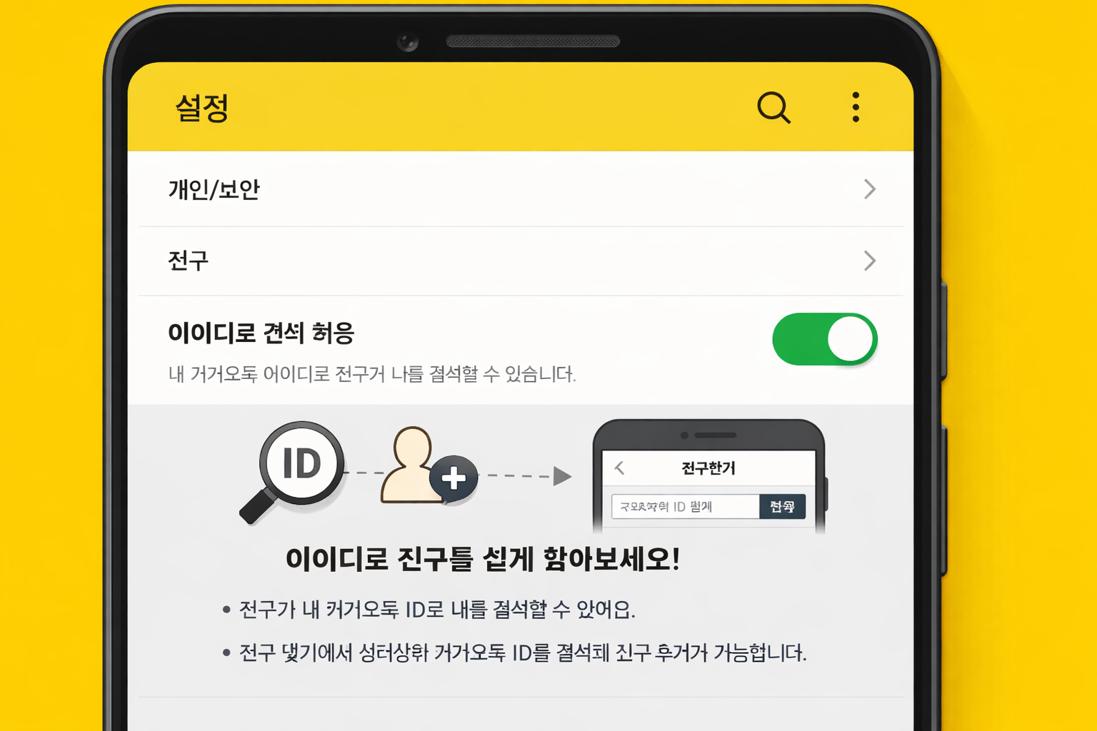 카카오톡은 기본적으로 전화번호로 친구 추가가 이루어지지만, 아이디 검색으로도 친구를 추가할 수 있습니다.