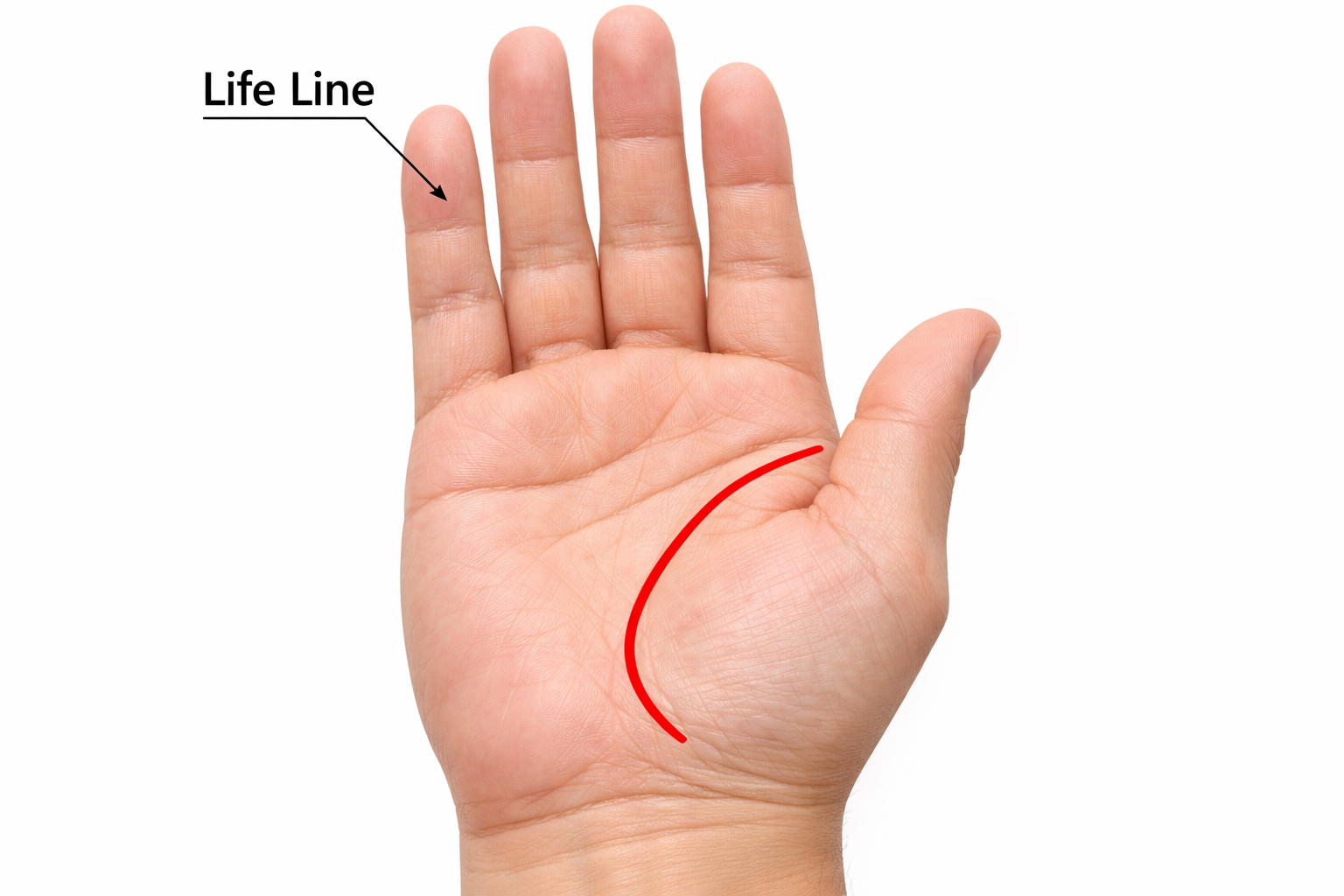 생명선은 엄지와 검지 사이에서 시작해 엄지 아래를 둥글게 감싸 내려가는 선입니다.