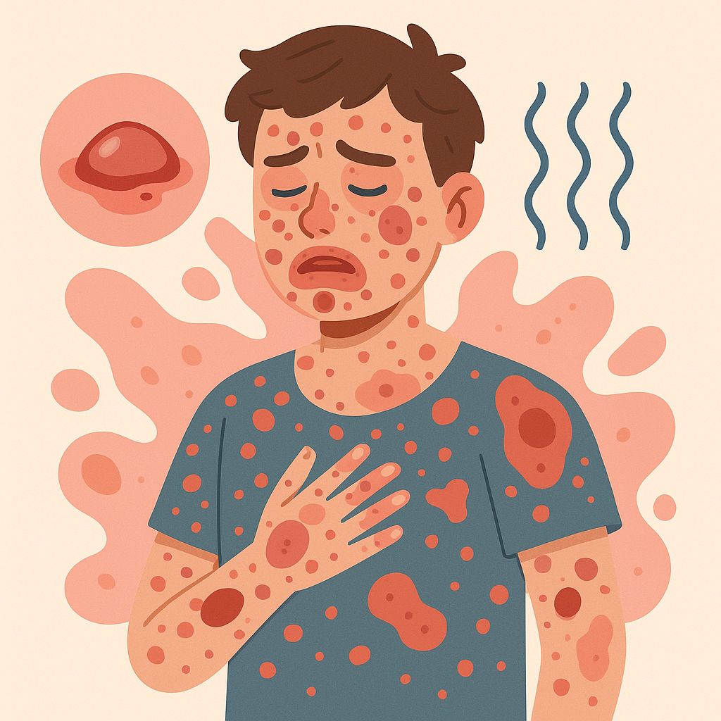 특히 감염성 발진(예: 홍역, 수두)과의 감별이 어렵기 때문에, 환자의 나이, 백신력, 동반 증상 등을 종합적으로 평가해야 합니다. 감별 진단이 지연되면 적절한 치료가 늦어져 예후를 악화시킬 수 있으므로 주의가 필요합니다.