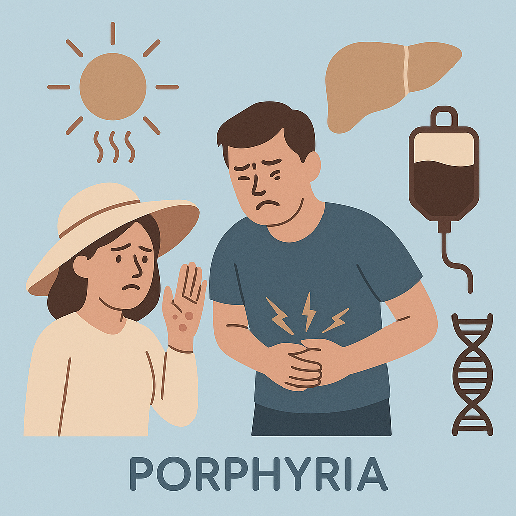 포르피린증은 매우 다양한 임상 양상을 보이므로, 초기 평가에서는 전신 증상과 가족력을 종합적으로 고려해야 합니다. 복통이 반복되며 원인이 불분명하거나, 광과민 반응이 반복된다면 포르피린 대사 장애를 의심해볼 수 있습니다. 특히 젊은 여성에게 반복적인 복통과 정신 증상이 있을 경우 반드시 급성형 포르피린증 가능성을 고려해야 합니다.