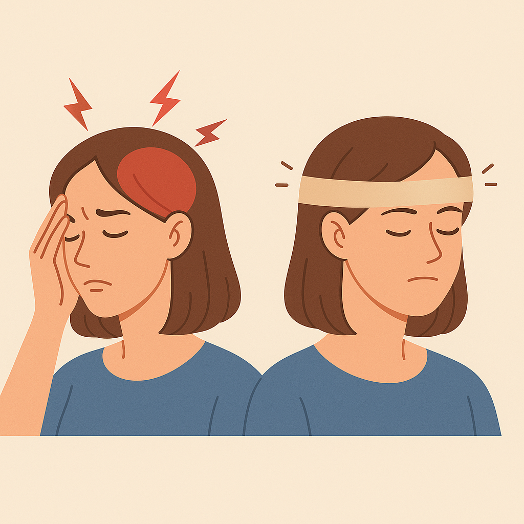 반면 긴장성 두통은 머리를 조이는 듯한 ‘압박성 통증’으로, 보통 양쪽에서 대칭적으로 나타납니다. 목과 어깨에서 시작되어 머리 전체로 퍼지는 양상이 흔하며, 움직임에 따라 통증이 심해지는 경우는 드뭅니다. 장시간 지속되지만 통증의 강도는 대체로 경미합니다.